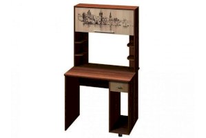 Компьютерный стол отличается компактными размерами и продуманным наполнением. Над столешницей находится надстройка. Под столешницей отделение под системный блок и ящик полного выдвижения.