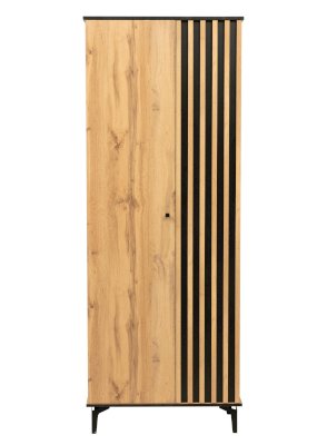 Торцы сверху и снизу покрыты черной пленкой и удачно гармонируют с реечным фасадом. Черные рамки подчеркивают границы шкафа. Внутренние полки и дверцы изнутри также выполнены в черном цвете. Таким образом достигается постоянный контраст, что выглядит очень эффектно!
