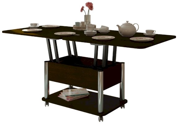Стол-трансформер - очень удобная вещь для экономии пространства дома. Оборудован колесиками. Стол имеет механизм трансформации, обеспечивающий одновременное раскладывание большой (с откидной частью) и малой (поддерживающей) столешницы, что позволяет образовать два конечных положения: