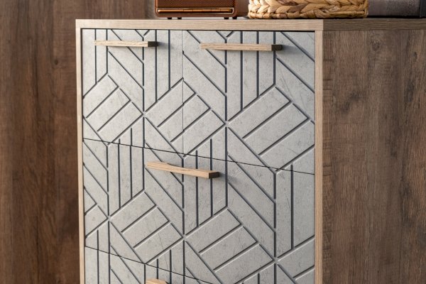 Комод Амстердам — вместительный и функциональный элемент как для спальни, так и гостиной. Модель оснащена тремя большими ящиками для хранения предметов одежды, текстиля и двумя маленькими — для личных вещей, документов, аксессуаров. Конструкцией предусмотрены шариковые направляющие полного выдвижения.