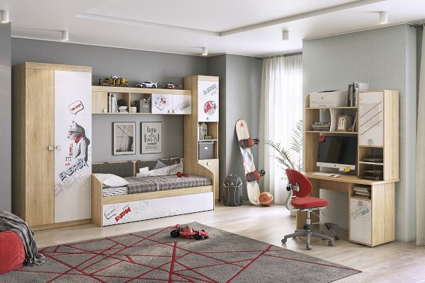 В нише и закрытой секции поместятся все учебники ребенка и обеспечат порядок на рабочем месте. Компактный и удобный прямой компьютерный стол из серии «Энерджи» может быть дополнен функциональной надстройкой. Главной особенностью данной коллекции являются современные принтерные рисунки.