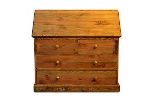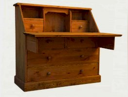Комбинированная конструкция классического типа. Имеет откидную панель. За ней находятся открытые отсеки и два ящика. В нижней части секретера расположены два широких и два узких ящика.