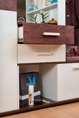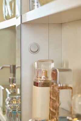 Шкаф МЦН 70 Норвуд включает множество элементов: крючки, стационарная штанга, открытые полки, выдвижные ящики, отделение за откидным фасадом, открытая ниша, зеркало с подсветкой. Встроенная светодиодная подсветка включается при помощи аккуратного кнопочного выключателя.