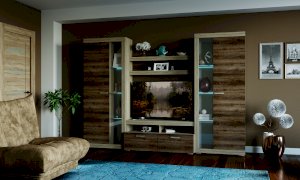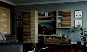 В гостиной Соната применяются современные европейские декоры: корпус выполнен из ЛДСП Дуб сонома, фасад из ЛДСП Дуб Сакраменто. Декоры отличаются выраженной тёплой древесной текстурой, а фасадная часть подчёркнута горизонтальными линиями текстуры и стильными планками МДФ, представляющими собой элементы корпуса и фасада.