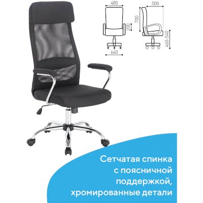 Надежное основание в виде металлического хромированного пятилучия обеспечивает длительную эксплуатацию и привлекательный внешний вид. Широкий мягкий подголовник и поясничная поддержка придают креслу дополнительный комфорт и формируют правильную эргономику.