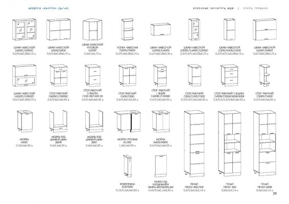 Глубина верхних шкафов указана без учета фасада, высота столов указана без учета столешницы