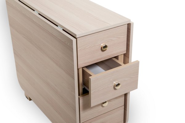 Преимуществом этого стола является наличие вместительных ящиков. В сложенном состоянии стол займёт совсем не много места и будет выполнять функцию комода или тумбы с ящиками.