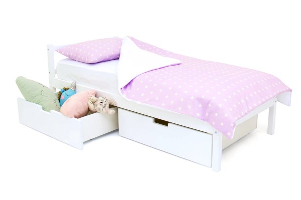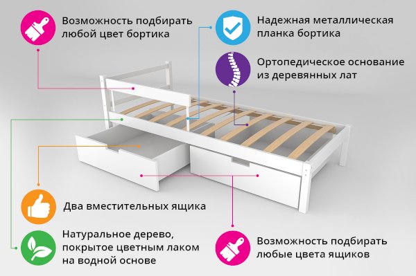 Для обеспечения безопасности малыша во время сна можно приобрести съемный бортик. Особенность его в том, что он закрывает кровать не по всей длине, а только ее часть, благодаря такому конструктиву, ребёнок легко сможет сам забираться на свое спальное место.
