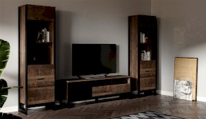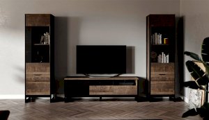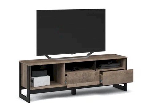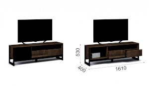 Функциональная тумба для TV и аудио аппаратуры оснащена двумя ящиками на телескопических направляющих, закрытыми и открытыми полками для хранения сопутствующих аксессуаров. Отсутствие лицевой фурнитуры подчеркивает минимализм и геометрию модуля. Особенность дизайна – это сочетание реалистичных по цвету и тактильности трендовых декоров, которые соответствуют последним городским тенденциям. «Дуб Гранж» привлекает имитацией вручную обработанного дерева и выразительной зернистой текстурой, характерной формой досок. Стильный серый цвет «Железного камня» с металлическими разводами и новая текстура состаренной штукатурки в сочетании с гладкостью металла вносят индустриальныи? колорит. Оригинальные ножки-опоры из МДФ контрастного цвета придают изюминку интерьеру.