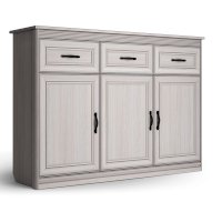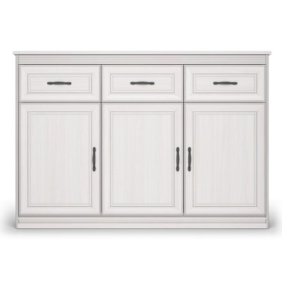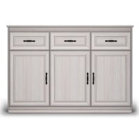 Нарядный образ большого комода в классическом стиле подчеркивают фигурные накладки и профили, а также металлические ручки цвета античная бронза.