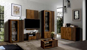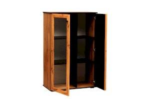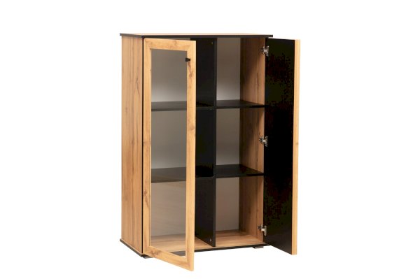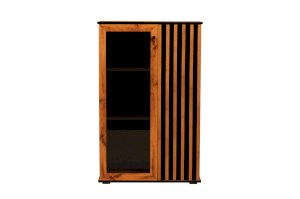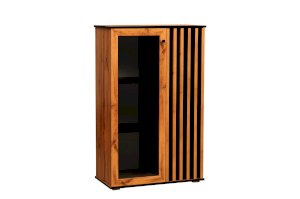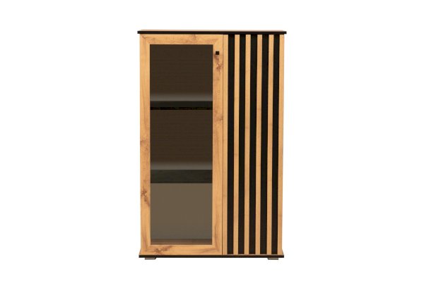 Шкаф визуально разделен на две части. В самом шкафу все просто – левое пространство за стеклом, правое – закрытое. Внутри – по три полки из ЛДСП. Каждая выдерживает вес до 5 кг. Стеклянная дверца обрамлена рамкой в цвет дерева, закрытая – с визитной карточкой коллекции –   с реечным фасадом. Они разной ширины, так как левая часть, по традиции коллекции, шире, а правая – уже. За стеклом отлично смотрится посуда и сувениры, за закрытой дверцей – книги.