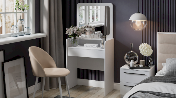 Туалетный стол «Эмма» в текстуре «Белый Ясень» идеально подойдет как для светлого помещения, так и для интерьеров в темных тонах, сделав комнату предметом особого внимания и притяжения.