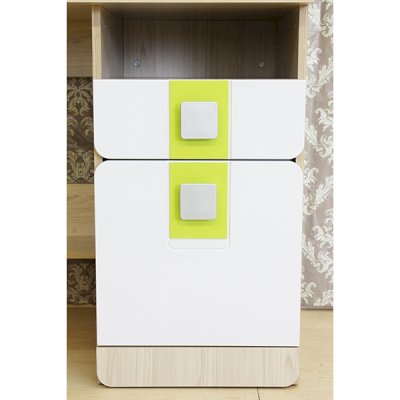 Мебель для детей «Стиль», выполненная в цвете «Лайм» подойдет как для младших, так и для старших школьников. Корпуса детской «Стиль» выполнены из ЛДСП толщиной 16 и 22 мм. Торцы обработаны кромкой ПВХ. Фасады выполнены из плиты МДФ, покрытых глянцевой пленкой белого цвета. Декоративные элементы на фасадах выполнены из МДФ с глянцевой пленкой ПВХ, по периметру подчеркнуты фрезеровкой. Все петли на фасадах с доводчиками. Направляющие на выкатных ящиках - шариковые, полного выдвижения. Мякгие элементы, скругленные углы, пластиковые ручки - все служит безопасности ребенка и придаёт эстетичный внешний вид.