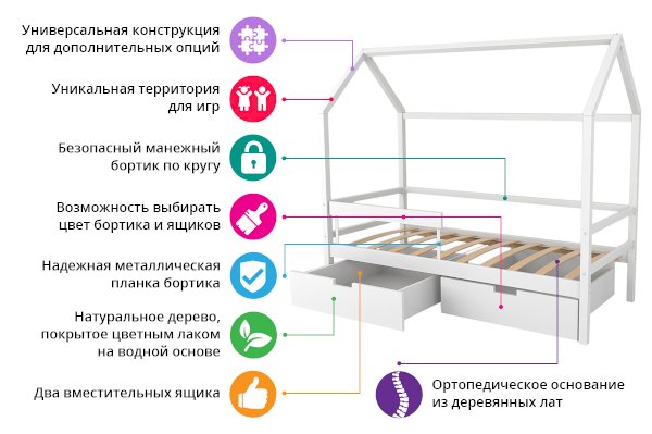 Кровать-домик легко превращается в целый замок для игр с помощью разноцветных тематических игровых накидок. Текстильная крыша на домике создаст ребенку уют и защищенное пространство.