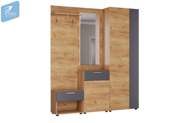 Модульная прихожая Сафари выполнена в современном выдержанном европейском стиле. Прихожая обладает элегантным дизайном, сочетающим изысканность цвета и фактур корпуса и фасадов яркого «Дуб Крафт золотой» и мягкого «Графит СОФТ».