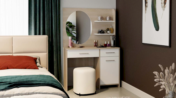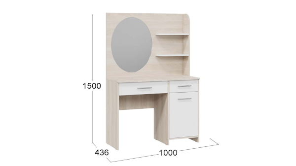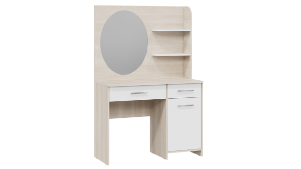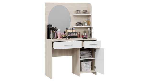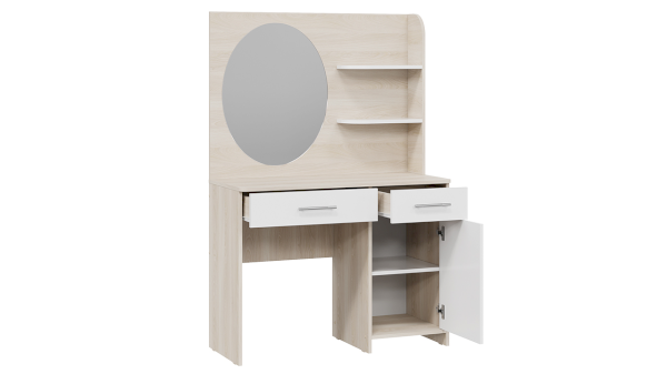Помимо внешней привлекательности стол имеет большое зеркало, а наличие открытых полок позволит установить предметы декора. Практичный выдвижной ящик и секция за распашной дверцей добавит места для необходимых мелочей. В этом туалетном столике нет ничего лишнего, только самое необходимое для уголка женской красоты.